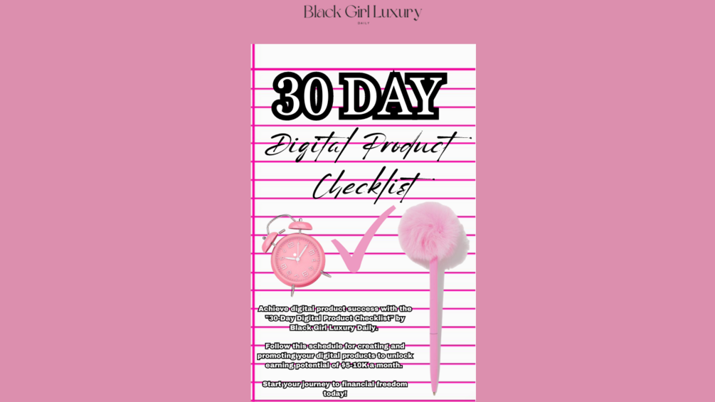 Gain digital product mastery with the "30-Day Digital Product Checklist" by Black Girl Luxury Daily. Download today and transform your ideas into lucrative products, unlocking the potential to earn $5-10K monthly.